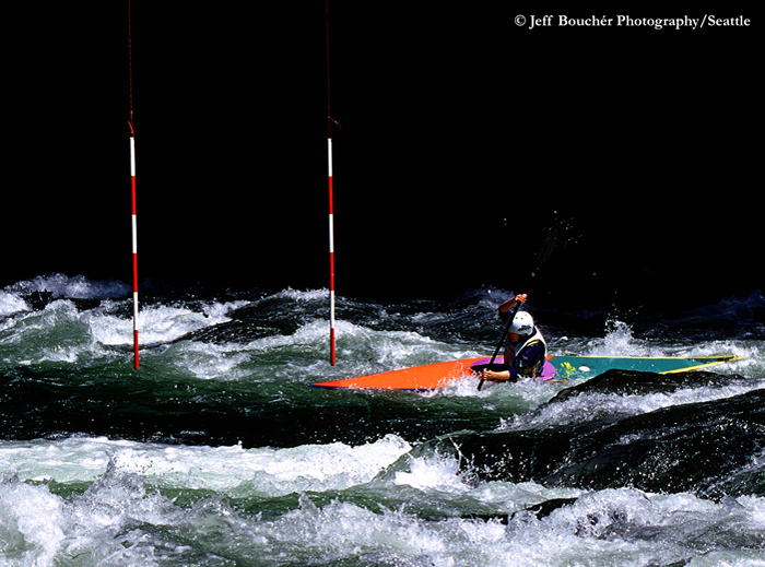 In slalom racing, kayakers & canoers attempt to negotiate a course made up of 18-25 downstream and upstream gates. Gates are defined by two poles spaced about 1 meter apart and hanging about 30 cm above the water. The paddler is timed from the start to the finish (last gate), and penalties are added to the elapsed time for touching a pole (2 sec) or missing a gate (50 sec). Much of the time elapsed involves entering eddies, paddling up through upstream gates and getting the boat out into the current. The power is in the water. It’s all about where you put your boat, not strength. Racers are given two runs, and the best run counts.